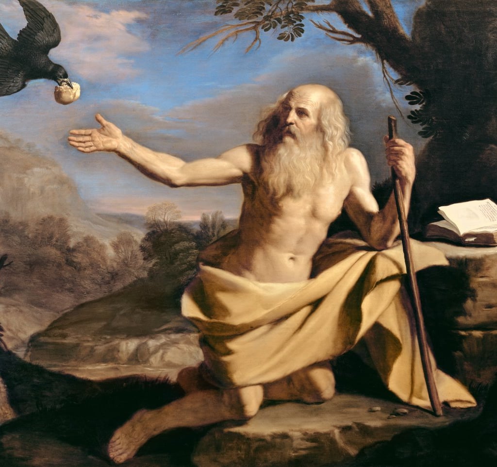 Paul, the institutor and master of Hermits, was born in Lower Thebaïs. He took his parents when he was fifteen years of age. Not long after that, in order to escape the persecution of Decius and Valerian, and to serve God the more freely, he withdrew into the desert, where he made a cave his dwelling. A palm-tree afforded him food and raiment, and there he lived to the age of a hundred and thirteen. About that time, he received a visit from Antony, who was ninety years old. God bade him visit Paul. The two Saints, though they had not previously known each other, saluted each other by a long and sweet embracing conversation on the kingdom of God, a crow which every day brought half a loaf of bread, carried them a whole one. When the crow had left them,